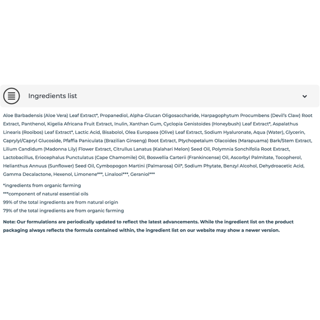 Pfaffia-, Marapuama- und Lilienextrakt bieten aufhellende und glättende Effekte. Prä- und Probiotika fördern ein gesundes Hautmikrobiom, während Teufelskralle und Kigelia das Elastin und Kollagen schützen und die Haut straffen. Niedermolekulare Hyaluronsäure spendet Feuchtigkeit und reduziert feine Linien.
