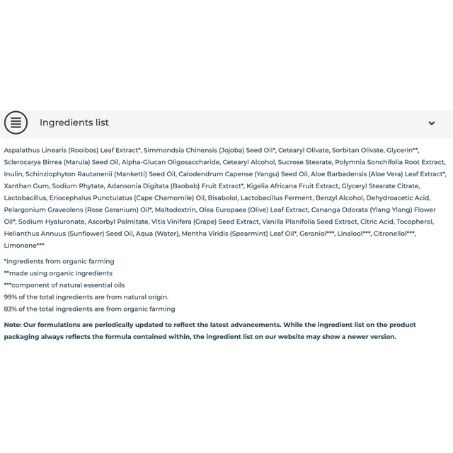 Die schnell einziehende Feuchtigkeitscreme versorgt die Haut mit Nährstoffen, ohne fettige Rückstände zu hinterlassen. Präbiotika und probiotische Extrakte fördern das Hautmikrobiom und stärken die Hautbarriere. Hyaluronsäure spendet Feuchtigkeit, glättet feine Linien und Antioxidantien wie Vitamin C, Rooibos- und Traubenkernextrakt schützen vor Umwelteinflüssen und Hautalterung. Kigelia-Extrakt strafft die Haut, während Yangu- und Manketti-Öl einen natürlichen Sonnenschutz (SPF 4) bieten.