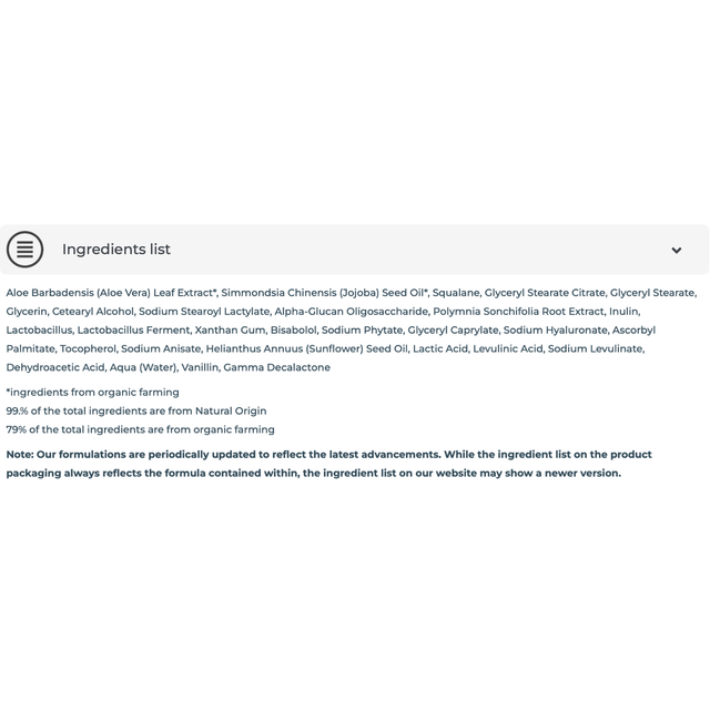 Diese sanfte, leichte und schnell einziehende Feuchtigkeitscreme auf Aloe-Vera-Basis ist reich an probiotischen Extrakten und präbiotischen Nährstoffen. Diese wertvollen Inhaltsstoffe fördern ein gesundes Hautmikrobiom, stärken die Haut und bieten optimalen Schutz. Besonders sensible Haut profitiert von der beruhigenden Wirkung und der intensiven Feuchtigkeitsversorgung.