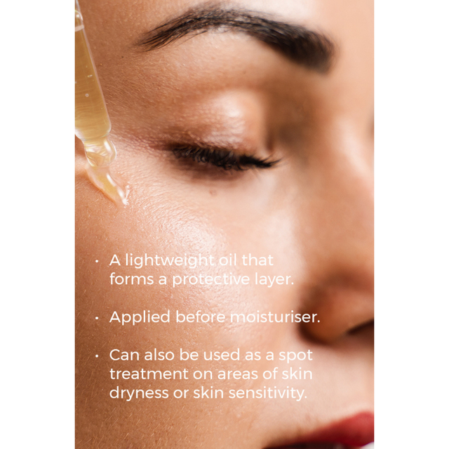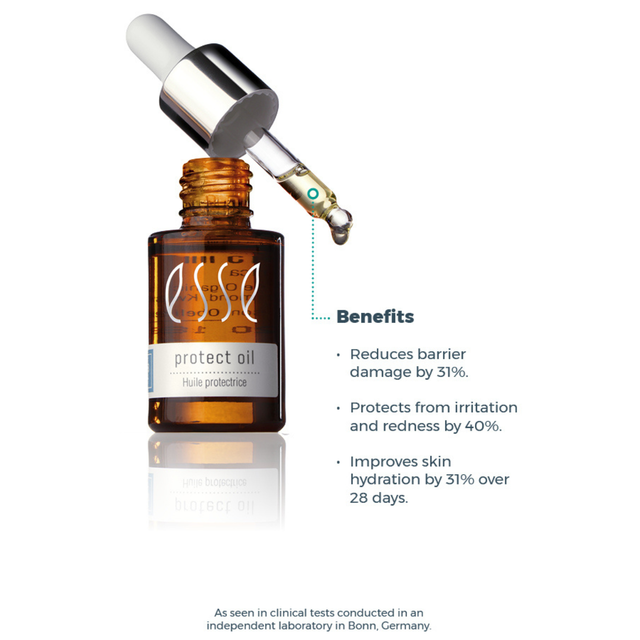 ANWENDUNG: 3-5 Tropfen vom Protect Oil gleichmässig auf Gesicht, Hals und Dekolleté sanft einklopfen oder einmassieren, bis es eingezogen ist. Danach einen ESSE Moisturiser auftragen.