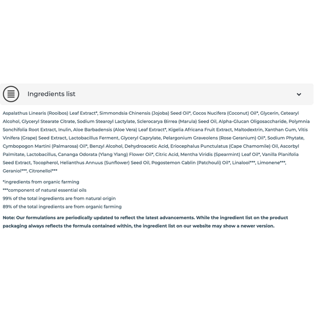 Der Rich Body Moisturiser ist eine intensiv pflegende Körperlotion, ideal bei trockener Haut. Die Formulierung kombiniert Rooibos-Extrakt mit seiner starken antioxidativen Wirkung zum Schutz vor frühzeitiger Hautalterung mit nährendem Marulaöl, das reich an essentiellen Omega-6-Fettsäuren ist. Die Haut wird tiefgehend mit Feuchtigkeit versorgt, geschmeidig gepflegt und fühlt sich sichtbar gestärkt und geglättet an.