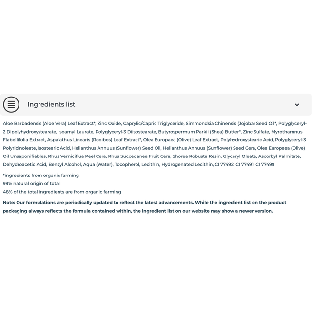 Ein zertifizierter mineralischer Sonnenschutz mit breitem Schutzspektrum, der vor UVA- und UVB-Strahlen schützt. Die Creme zieht schnell ein, hinterlässt keinen weissen Film und ist frei von Duftstoffen sowie mild konserviert, wodurch sie auch für empfindliche Haut geeignet ist. Antioxidantien wie Myrothamnus-, Rooibos- und Olivenblattextrakte schützen die Haut, indem sie freie Radikale abfangen, die durch UV-Strahlung entstehen.