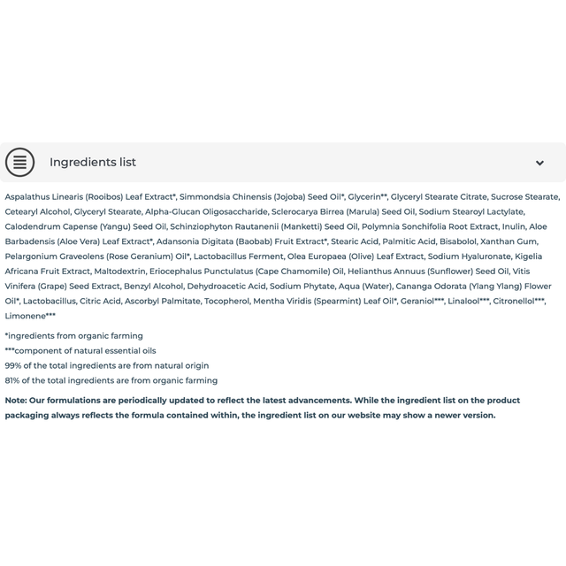 Die nährende Creme mit Shea Butter und Aloe Vera regeneriert und schützt sehr trockene Haut. Prä- und Postbiotika stärken das Hautmikrobiom und die Barrierefunktion. Hyaluronsäure versorgt die Haut mit Feuchtigkeit und reduziert feine Linien. Marulaöl unterstützt die Barriere, während Antioxidantien wie Vitamin C, Rooibos- und Traubenkernextrakt vor Umwelteinflüssen und lichtbedingter Hautalterung schützen. Yangu- und Mankettiöl bieten natürlichen Lichtschutz (ca. SPF 4).
